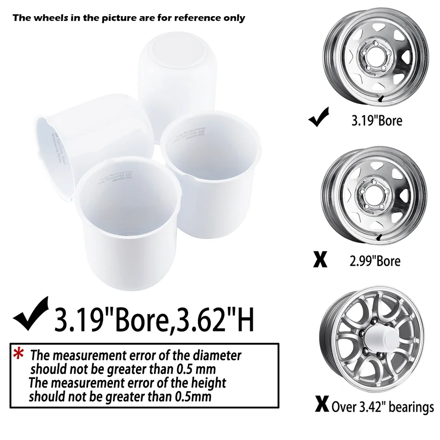 - 3.19” push-thru center cap fit for 3.19″ center bore only. It is a replacement rim center cover for a trailer truck SUV or RV wheel. Please ensure the caps are the correct application for your rim. An easy but effective and quick way to upgrade your car’s appearance is with these wheel center hub caps.