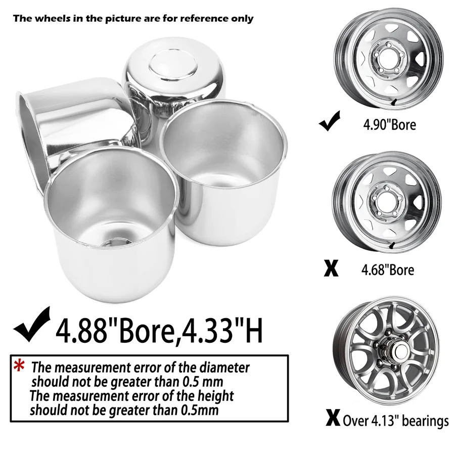 - 4.88” push-thru center cap fit for 4.88″ center bore only. It is a replacement rim center cover for a trailer truck SUV or RV wheel. Please ensure the caps are the correct application for your rim. An easy but effective and quick way to upgrade your car’s appearance is with these hub center rim caps.