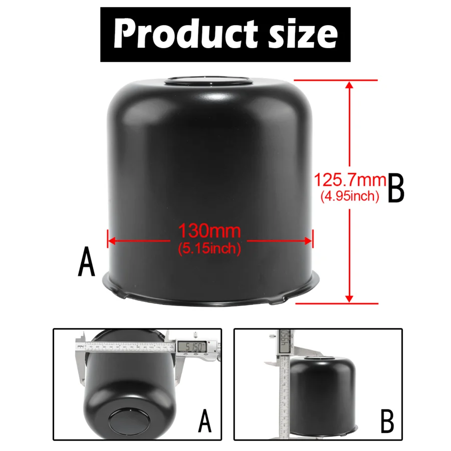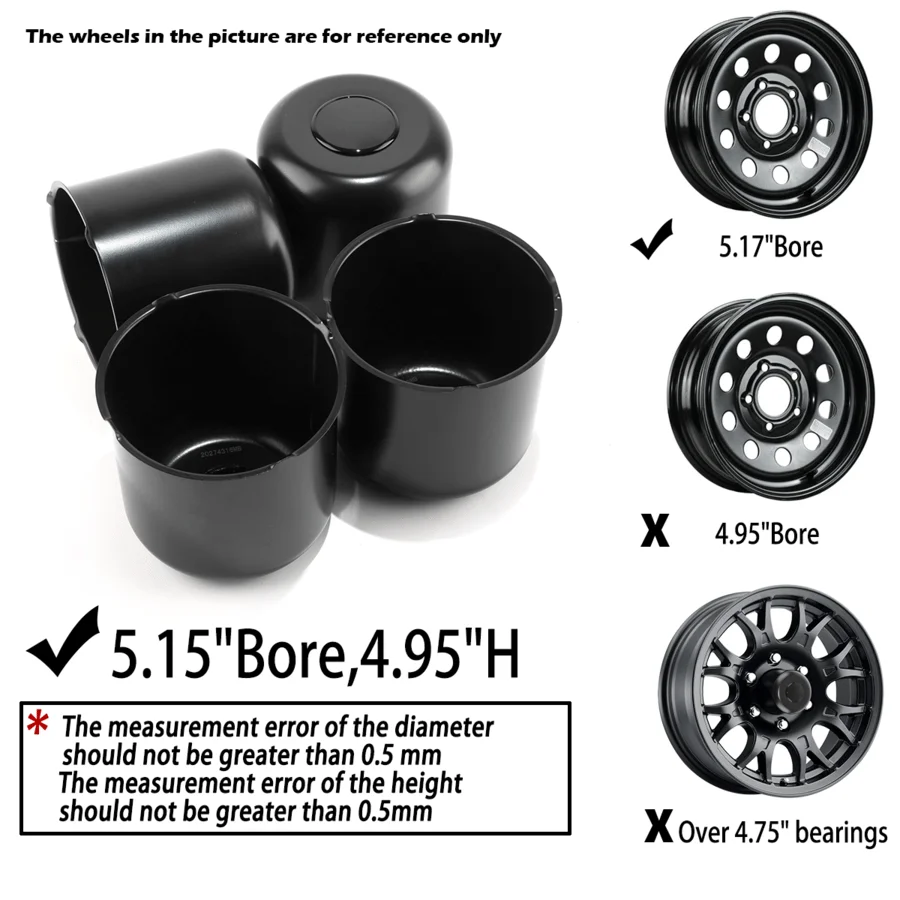 The 4.88"center bore and 4.33"H Wheel Center Caps perfectly fit for truck, trailer, SUV and RV wheel hubs. They are made of carbon steel and anti-corrosion. If you want to wholesale other center caps, you can consult our customization service.